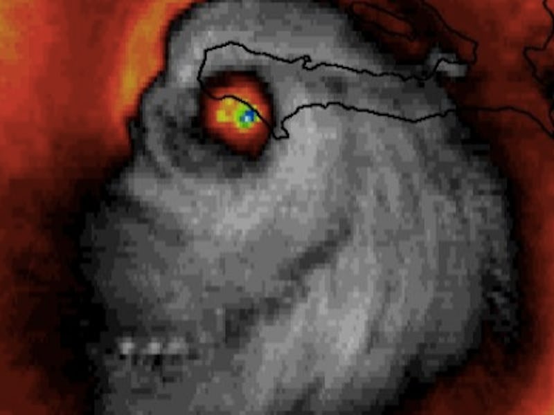Get behind us, Satan: The Devil appears to be named Matthew, and he’s coming down on the Americas in the form of a skeleton-faced hurricane. In a tweet posted Tuesday, Weather Channel meteorologist Stu Astro called attention to the grinning demon face that materialized in an infrared satellite image of the storm, which held, in the socket of its skull, a maniacal, prismatic eye.