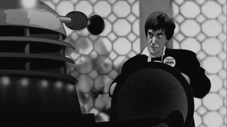 In 2013, the animated version of “The Tenth Planet”‘s last chapter restored the final moments of the 1st Doctor, and the new forthcoming restoration — “The Power of the Daleks” — picks up right where that one left off. The Doctor has regenerated for the first time even though back then, he just called it “renewal.” After not telling his companions Ben and Polly that he totally is the Doctor, they all fly over to “the Planet Vulcan” where they immediately get involved in a murder mystery.