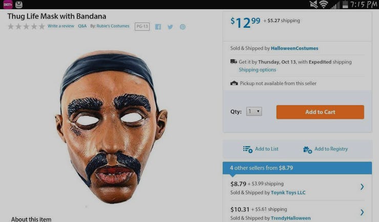Walmart has pulled their “Thug Life Mask with Bandana” Halloween costume after numerous customers were outraged with the product. Originally priced at $12.99, the mask attracted numerous complaints on social media for reasons that seem both obvious and subtle. The mask is clearly intended to resemble Tupac Shakur, the assassinated rapper who had the words “Thug Life” tattooed on his stomach. The mask has “THUG” tattooed under the right eye. It’s problematic not only because Tupac had changes of heart about his self-representation, writing a letter entitled “Is Thug Life Dead?” from jail, but also because members of the black community protesting police brutality have been dubbed thugs by many commentators.