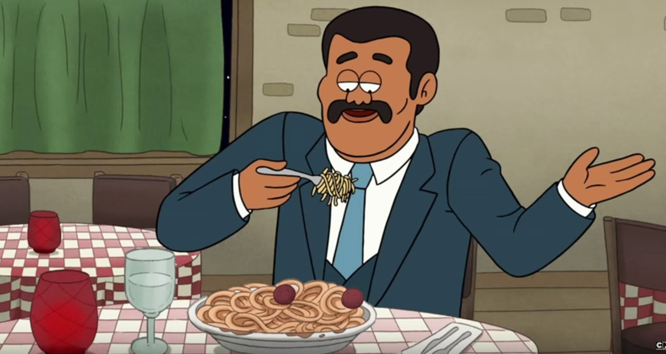 Astrophysicist and cartoon aficionado Neil deGrasse Tyson will be spitting science and slurping spaghetti on the upcoming Halloween episode of the Regular Show. In the teaser released by Cartoon Network, problematic favorite Tyson is ready to dine on leads Mordecai and Rigby after they’ve tumbled into a black hole and are turned into spaghetti.