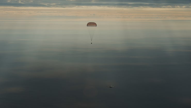 As the capsule plummeted through the atmosphere, a series of parachutes deployed on time to help slow the vehicle. Just before touchdown, a set of six thrusters ignited, further slowing the Soyuz and allowing the vehicle to land upright and right on schedule.