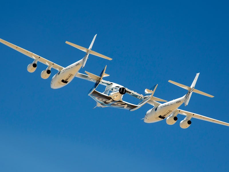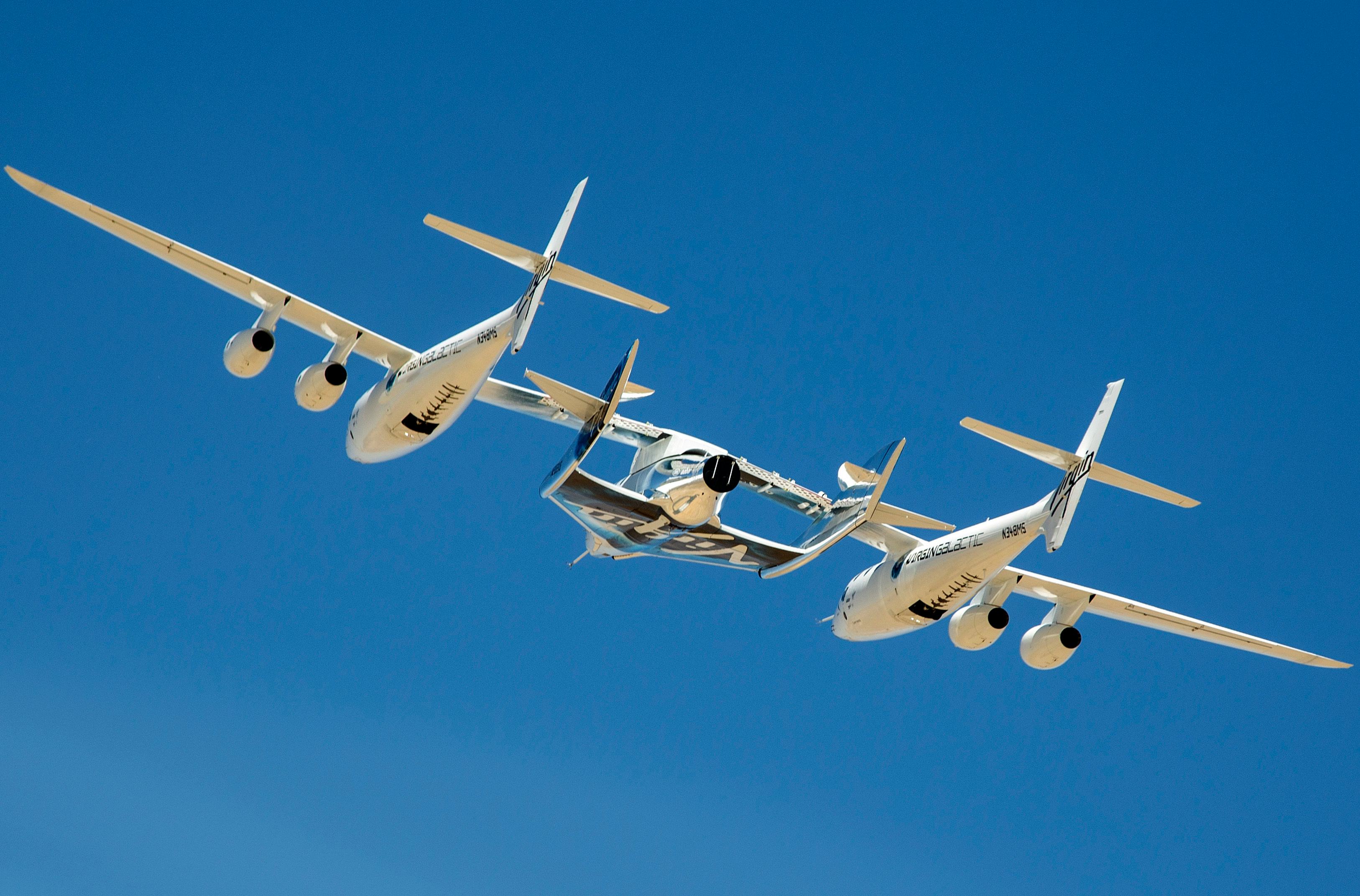 Virgin Galactic's VMS Eve carries the VSS Unity (center) during a September test flight
