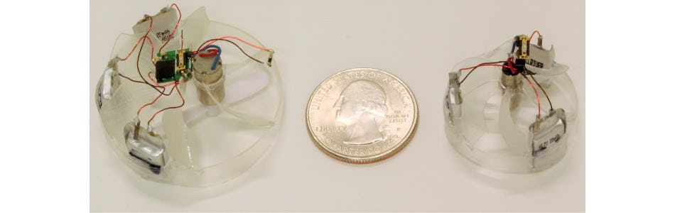 Piccolissimo — Italian for “tiniest” — is actually the name of two devices. The first consists of little more than a propeller, a power source, and an infrared receiver that tells it how fast to spin; the whole thing is about the size of a quarter. The other version has some extra parts that allow it to maneuver, and it’s about a centimeter wider than its little brother.