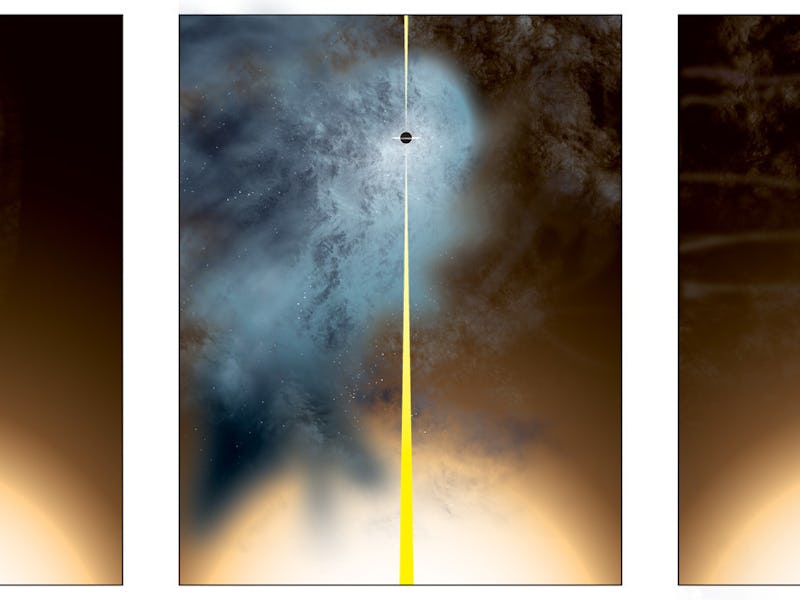 This type of cosmic collision is commonplace, especially within larger galaxy clusters, like ZwCl 8193, where B3 1715+425’s galaxy lives. Astronomers think that the largest galaxies in the universe formed through galaxy mergers. Typically when galaxies merge, the two black holes within those galaxies take part in a dramatic orbital dance, with the pair orbiting each other until they eventually combine. (The LIGO experiment saw proof of this last September).