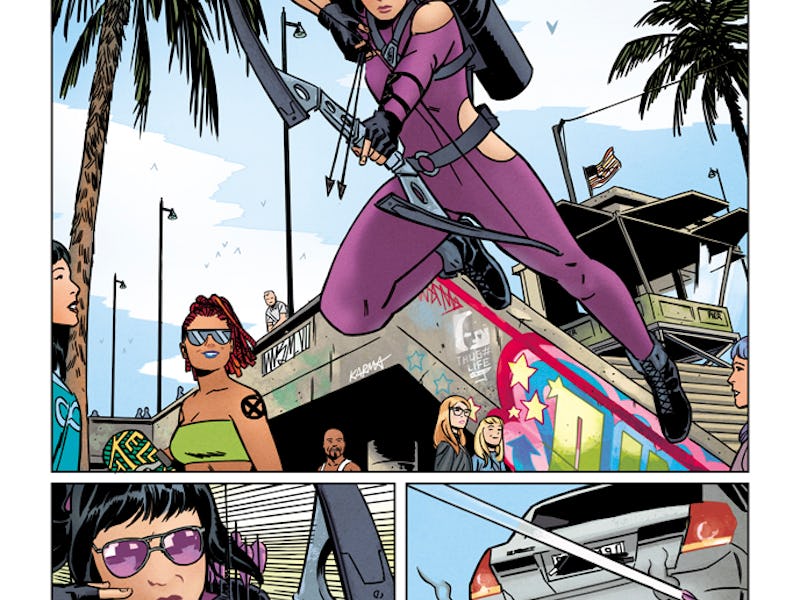 On Friday, Marvel released preview art depicting Kate Bishop, the female marksman in the Young Avengers, as the lead in Hawkeye #1. Written by A-Force’s Kelly Thompson and illustrated by Doctor Strange’s Leonardo Romero, the series will follow Bishop in California, as she works as a private investigator and, presumably, shoot things at impressively far distances.