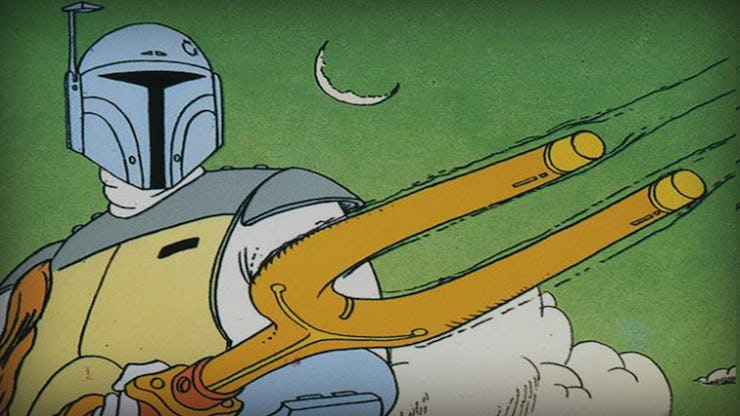 Of course, certain members of the Star Wars marketing team in the ‘70s and ‘80s initially conceived of Boba Fett as a much bigger deal. Former Lucasfilm employee Craig Miller revealed to Inverse back in May that the character was being considered for much more screen time than eventually happened. And everything about Boba’s appearance in this original cartoon supports that idea: Before blasting off in his jetpack, Boba Fett tells Luke “We’ll meet again!”