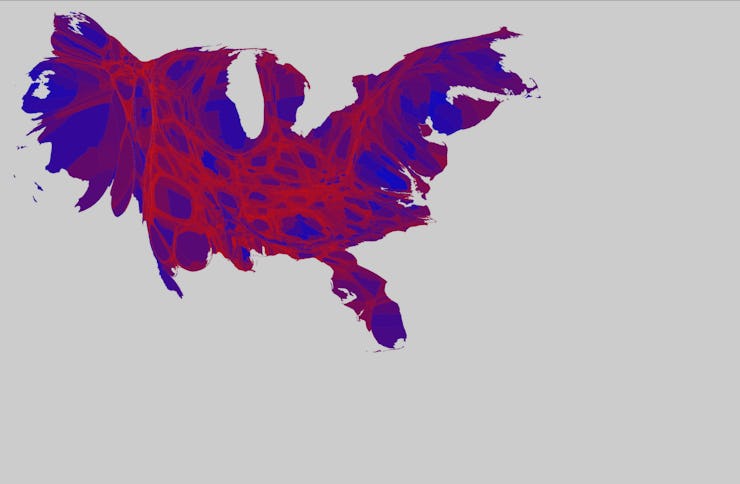 You can see that there are still strong liberal and conservative areas, like the conservative swathes of the Great Plains and the heavily liberal, urban pockets of the South and California coast, but everything else is less clear. And if you make a cartogram of the whole thing, it looks even crazier. Newman’s final map makes the most populous counties in the country look huge, twisting the whole country into a tie-dye kaleidoscope of blue, red, and purple.