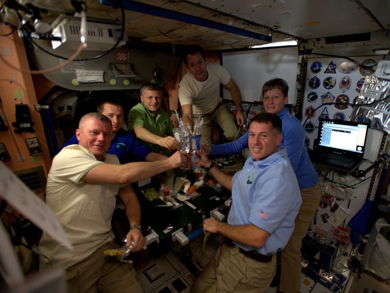 The six expedition 50 crew members celebrate Thanksgiving in space.