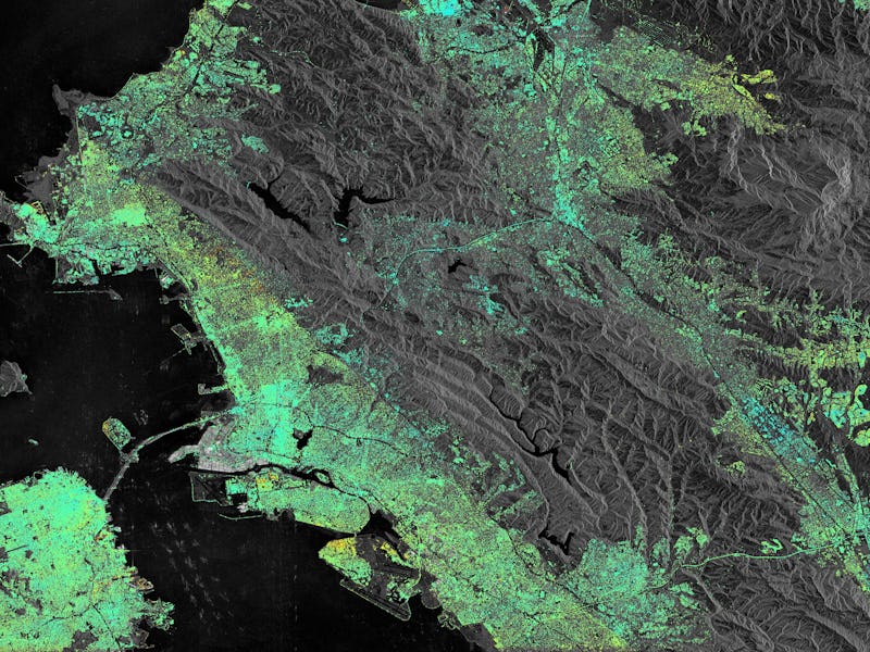 The image also shows some activity along the Hayward fault, which runs north to south along the eastern side of the Bay. The Hayward fault has been pretty quiet since the late 1800s, probably thanks to the nearby San Andreas fault taking care of some of the tectonic tension in the area. But in the ESA’s image, some areas have sunk (in yellow), while other areas have been lifted (in blue).