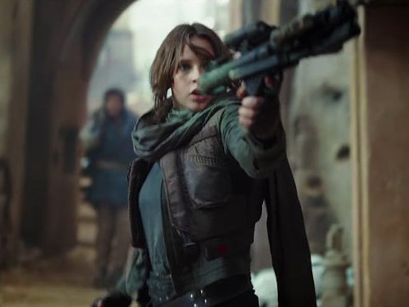 There’s a lot going on in the brief 40-second clip. Cassian Andor and Jyn Erso are running for cover in a marketplace, blasting away at stormtroopers, while totally appropriate Star Wars-chase music blares. Suddenly, Jyn pulls out a baton-type weapon and beats the stormtroopers senseless while Cassian looks on, feeling as though there isn’t much he needs to do to help. His raised-eyebrows expression says it all: Jyn’s got this.