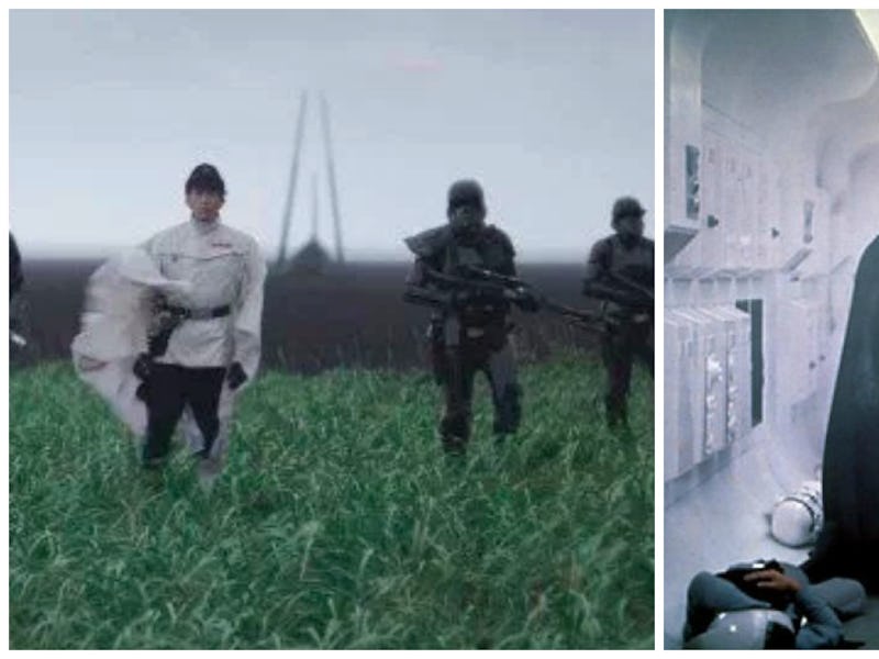 The aesthetic similarities and inversions to the original Star Wars film are telling, too. In this first scene in Rogue One Krennic is presumably confronting the Jyn’s father, Galen Erso, while Jyn watches from distance. In A New Hope, Vader was confronting his daughter, Princess Leia about the Death Star plans. Meaning now at least two Star Wars movies will open with fathers and daughters, subverting the idea that these films are primarily about fathers and sons.