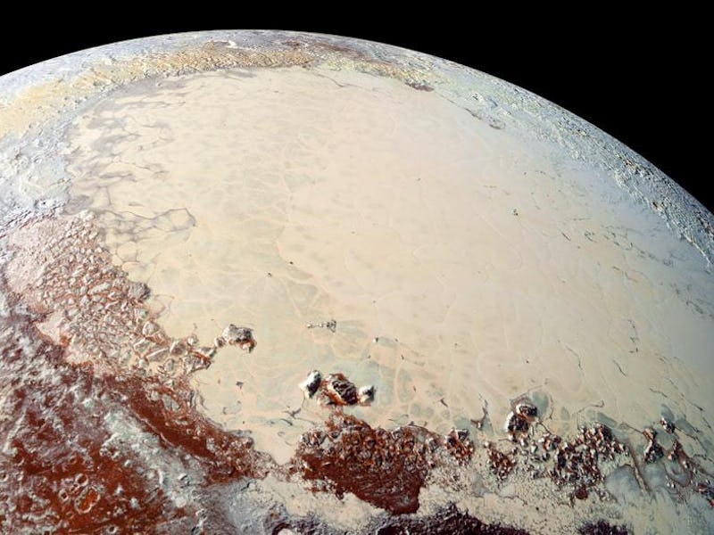 The region informally named Sputnik Planitia is a deep basin thought to be a remnant of an ancient collision. The would-be crater has been filled in over time with a mixture of three kinds of ices — frozen nitrogen, methane and carbon monoxide — and is located on the surface opposite of Charon (which is Pluto’s large, tidally locked moon).