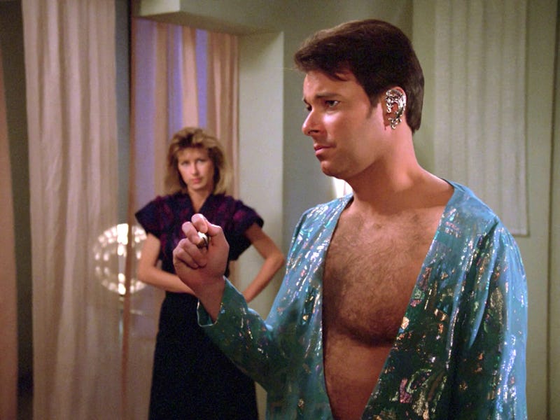 In the shirtless Riker department though, Star Trek has been severely lacking. Other than his famous get-up in the episode “Angel One,” Riker didn’t take his shirt off much on The Next Generation, accept when he got hurt and went to sickbay.