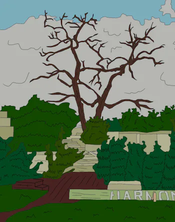 Since its founding in 1896, the Native American grounds of Harmony Grove in the form of Harmony Grove Village have become very gentrified. It’s now a sterile, Stepford ticky-tacky development intended for white families who don’t want to clog their children’s Aryan lungs in the city. Very un-spiritual. I weave down Starry Night Road, Country Living Way, and Coffee Bean Lane, somehow surviving the hike without retching. My spirit is being drained, so I really need to get to this camp ASAP.