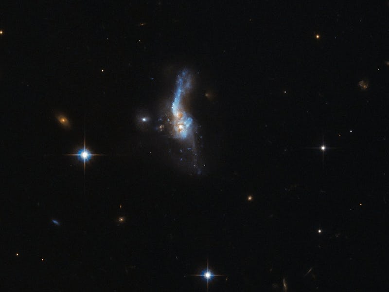 Don’t let the soft, serene hues of blue and gold fool you — the phallic blue smudge in this new image, taken by the Hubble Space Telescope, is actually the tempestuous marriage of two spiral galaxies that collided into one another millions of years ago.