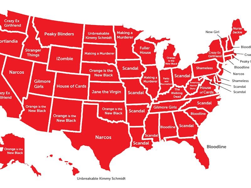 As the map’s creators point out, some wonderful trends pop up upon viewing the map. Southerners prefer the drama and violence that comes with Scandal and Bloodline; Westerners love the crime in Narcos and Orange is the New Black; the Pacific coast likes to chill with Crazy Ex-Girlfriend and Portlandia (shockingly enough, Oregon loves Portlandia); and New England is a mish-mash of female-led dramas and comedies, such as Crazy Ex-Girlfriend, Shameless, New Girl, and Nurse Jackie.