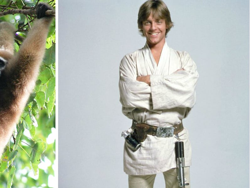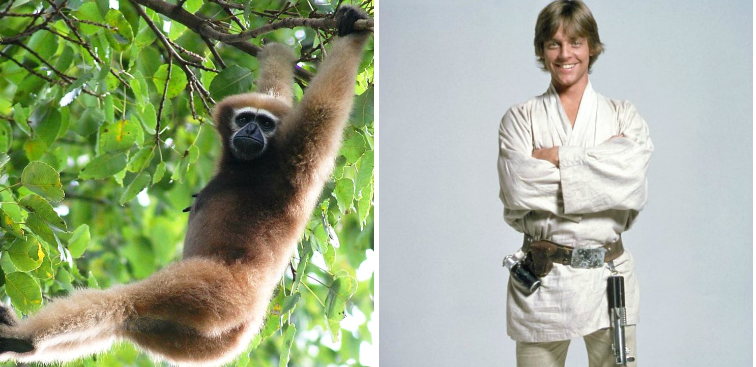 While Hamill is just trying to be a joker, gibbons are very different than gorillas. While both apes, gibbons are lesser apes while gorillas are in a taxonomic family called great apes. Adult gibbons are an average of 3 feet tall and weigh between 12 and 20 pounds. They are known for their hooting calls and their ability to gracefully and powerfully swing through the jungle — not unlike other Skywalkers that we know.