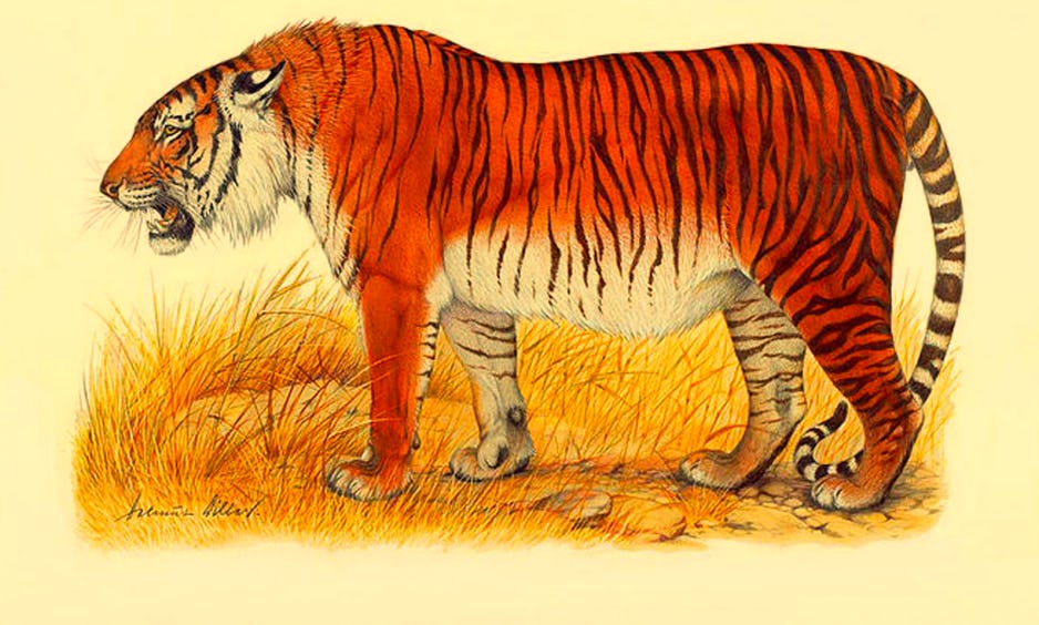 Caspian tigers once ranged throughout Turkey, Iran, Iraq, northwestern China, and much of Central Asia. Their extinction stemmed from poisoning and trappings at the hands of Soviet Union-encouraged bounty hunters, and they were eventually exterminated when irrigation projects destroyed their and their prey’s habitats.
