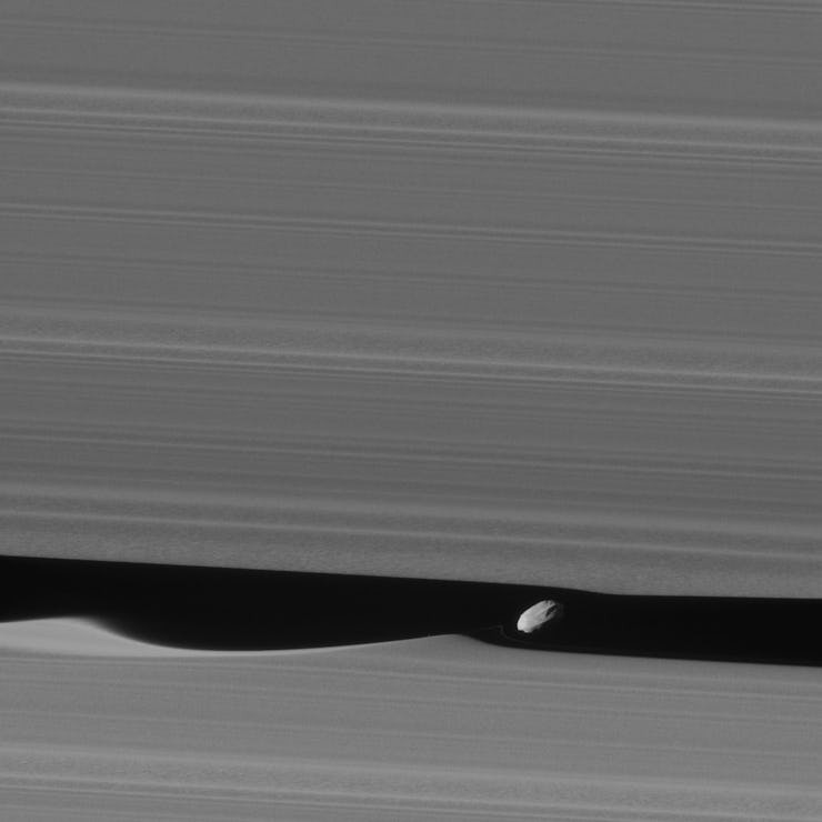 On Monday, NASA’s Cassini flew by Daphnis, a special moon of Saturn that’s known as a wavemaker. Even though it’s quite small (only five miles across), Daphnis has the unique ability to create visible “waves” on Saturn’s rings as it orbits the planet. Cassini managed to capture this spectacular phenomenon as it was unfolding, and the resulting image looks beyond amazing.