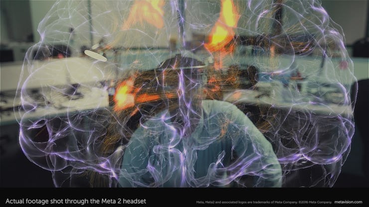 Right now, the Meta 2 is tethered to a computer — Windows-only at the moment, but it’ll be Mac-compatible soon — with a nine-foot cord. The goal is to have a “prosumer” model out in 2018, and glasses on the market in 2020. That portability will be essential to achieve the Meta’s goals, which include eradicating the need for a smartphone. For example, instead of looking down at Google Maps for directions, they want to highlight the trail right in front of your eyes. And being able to watch TV across from someone on a semi-transparent screen, and move the display around to track your head, is another idea that will soon be possible, even without the glasses.