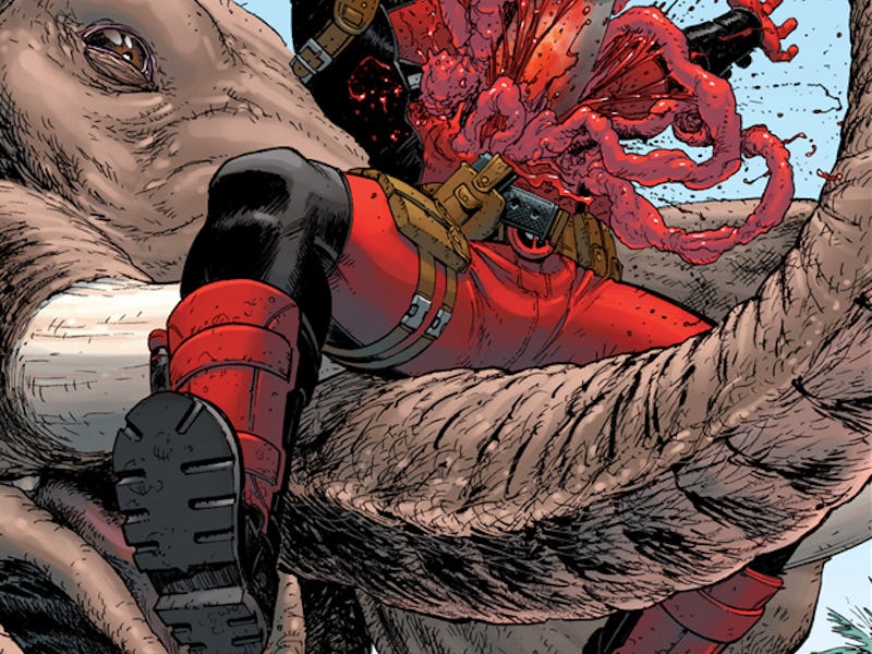 Every month, Spider-Man and Deadpool end up on a wild adventure in their joint Spider-Man/Deadpool series. This week, a couple of witches use Deadpool as a sacrifice to summon his true love, Spider-Man, and then the Merc with the Mouth also he got eaten by a kaiju (and lived).
