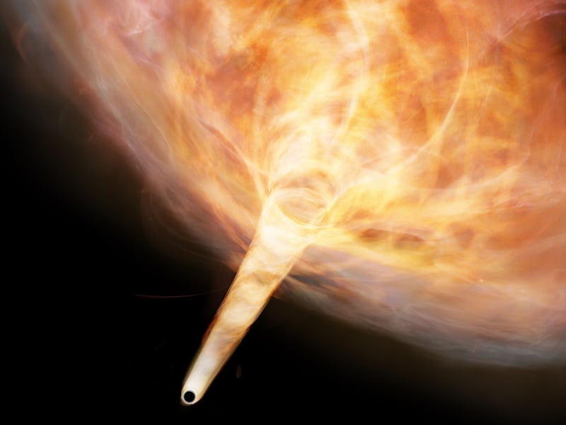 The team proposed two scenarios for how “Bullet” formed. In one scenario, the expanding gas shell of W44 passes by a black hole. The black hole sucks the gas in, causing an explosion and accelerating the gas toward us. In the other, a fierce, high- speed black hole blasts through dense gas, which ends up getting dragged along with the black hole to form a gas stream.