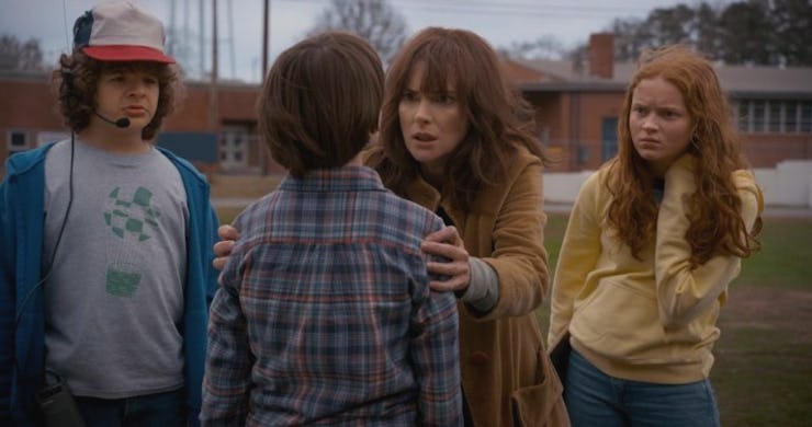 The first image is all drama. Winona Ryder’s Joyce Byers clings to her son Will’s shoulders while his best bud Dustin looks on. He might even be relaying the emergency to the rest of their friends via that microphone headset. Something is clearly wrong, but Joyce and Dustin have seen some weird Demogorgon-based stuff before, especially with Will. Presumably someone who hasn’t faced an interdimensional being before stands to their right.