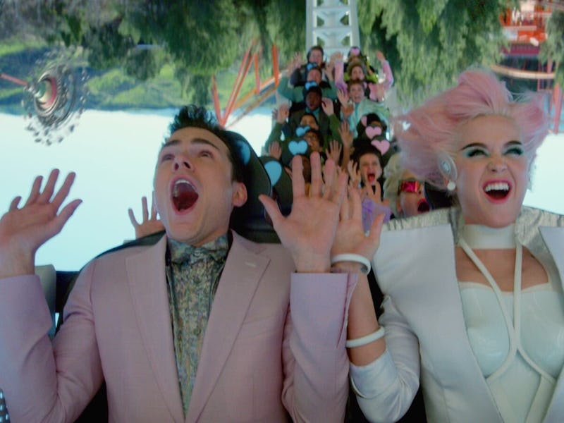 Kicking things off in the video, released on Tuesday, Perry walks through the front gates of a seemingly pleasant enough amusement park named “Oblivia.” Everything looks straight out of vintage science fiction illustrations, along with embracing a Jetsons aesthetic. Beyond the flying aircraft and metallic clothes, the music video mashes up with some more current themes of today’s society; there are visitors who can’t put down their screens while walking, an attraction called the “American Dream Drop,” a roller coaster that blasts through a tunnel full of Facebook reactions, and more. It all appears to be a trip to a futuristic Six Flags with an added bonus of political commentary.