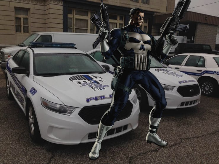 In Catlettsburg, in eastern Kentucky, the town’s police purchased decals of the Punisher’s skull, modified with colors from Blue Lives Matter, and placed on the department’s sedans and SUVs. Police Chief Cameron Logan, who thought it was a warrior symbol, said the decal was meant “to give back” to the officers. “That decal represents that we will take any means necessary to keep our community safe.”