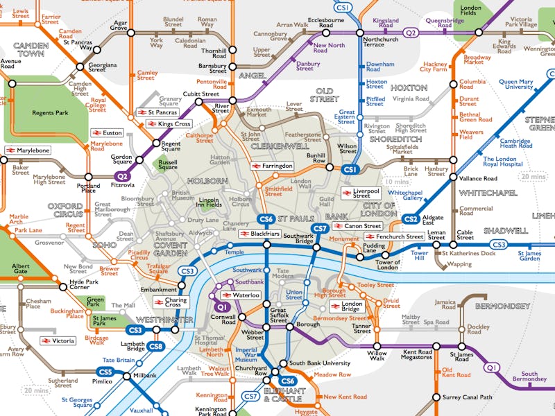 This Cycle Superhighway post even includes symbols that show which points have a tube station.