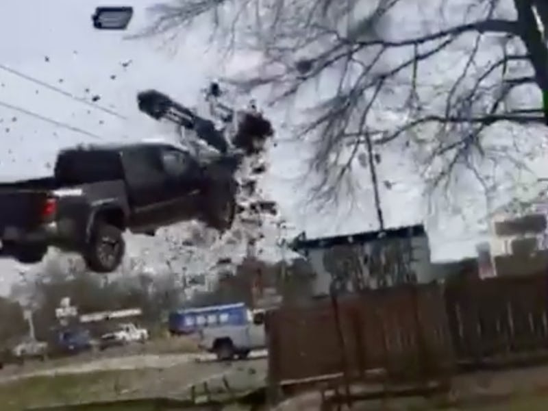 For decades now, people have been complaining that nobody has invented a flying car yet. Turns out there’s actually a really easy way to get a 2-ton automobile in the air: lay down a couple spike strips in front of a speeding truck.