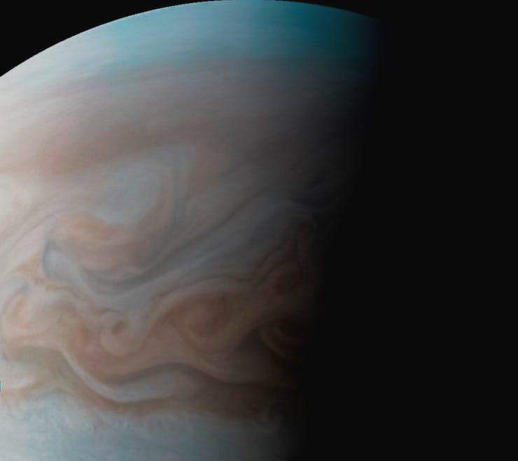 With their sweeping hues of blue and red creating a stunning portrait of spiraling curves, the whirling clouds of Jupiter look like a distant cousin of Vincent van Gogh’s famed The Starry Night painting — at least in this new image captured by NASA’s Juno spacecraft.