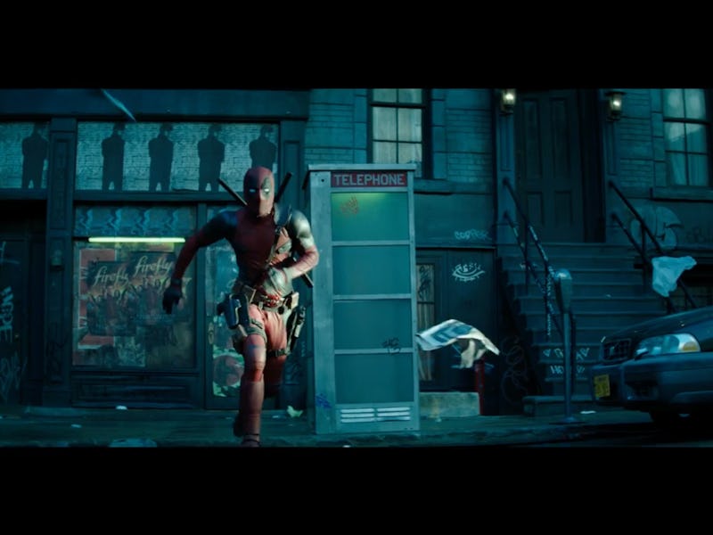 The trailer begins with Reynolds as Wade Wilson walking down a city street. He spots a man with a gun mugging an older man in an alley, and he leaps into action. The shot widens to show him in front of a theater that’s showing Logan. He dashes to a phone booth and struggles to get inside with his backpack. Once he’s in, he evokes a stumbling, nervous Superman as he awkwardly changes out of his street clothes and into his signature Deadpool getup. At one point Wilson drops his pants and treats the audience to a pressed ham. He then wrestles his outfit on, dual katanas and all, rocking the tiny phone booth on its foundation. In classic Deadpool fashion, he chooses this highly inappropriate moment to drop a dime and make a quick phone call.