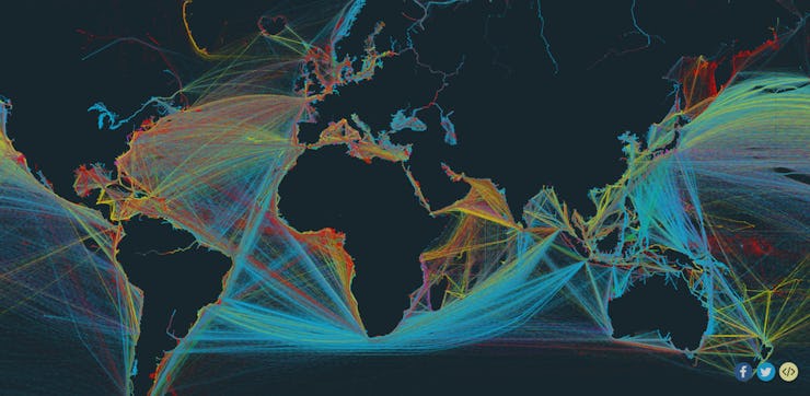 A map created by data visualization firm Kiln uses information from the UCL Energy Institute, showing movements of the global merchant fleet over the course of 2012. It reveals the hidden routes that criss-cross the world, forming a complex network of global cargo movements. Although it moves across empty seascapes, cargo liner shipping accounts for about two-thirds of all global trade. Check out the map below, or visit the ShipMap website for an awesome interactive version.