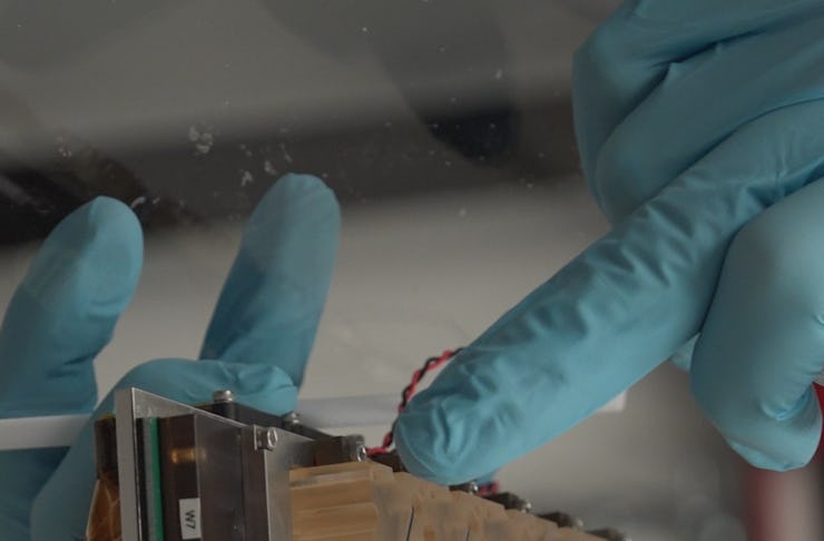 Mounted on the EVATAR’s clear block of plastic are finger-length pools filled with various green and blue fluids: These are individual three-dimensional models of the female reproductive system’s parts — the ovaries, fallopian tubes, the uterus, cervix, vagina, and liver — and the strange liquid that pumps through it circuitously is its blood. Lining each of the system’s parts are living human tissues from each of the respective organs.