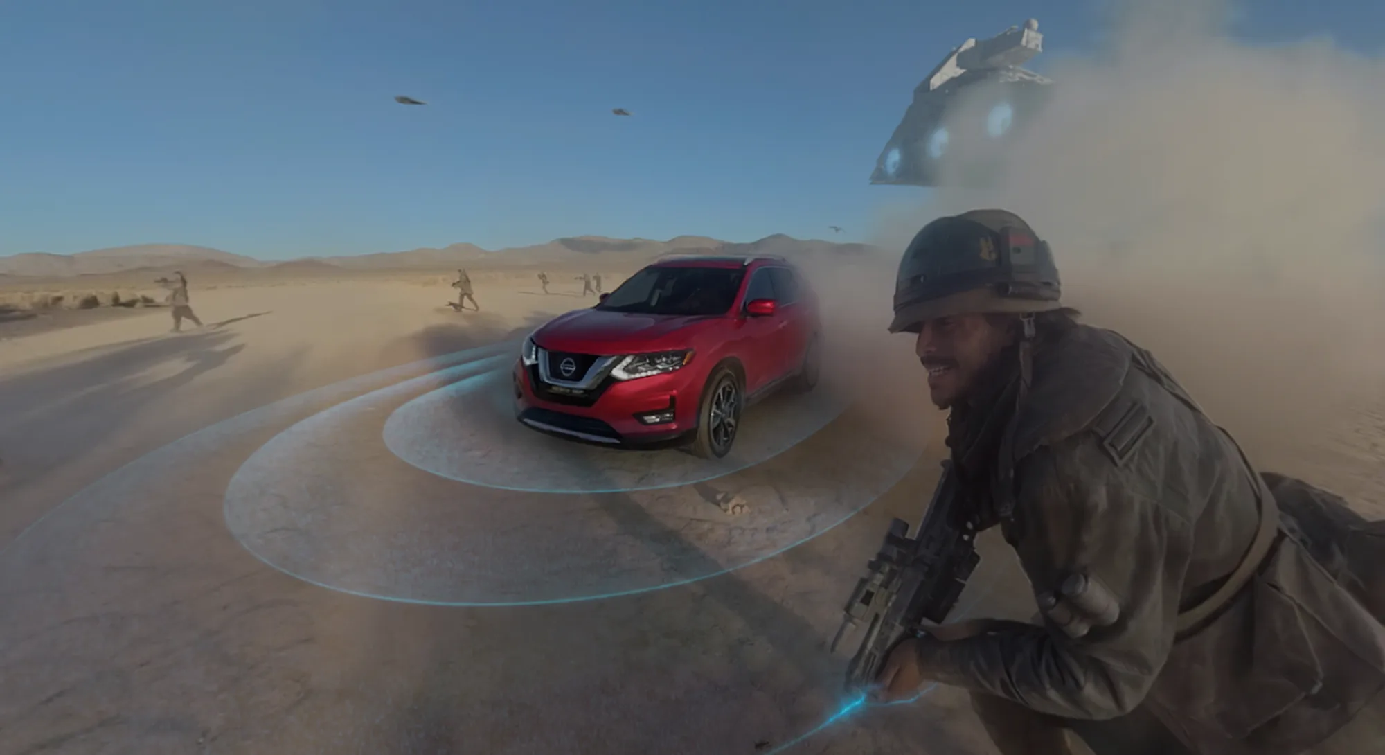 Where I had once been standing in the LucasFilm studios in San Francisco, I found myself instantly transported to the Mojave Desert. Perched in the sand before me is a Nissan Rogue, the car company’s best-selling vehicle. A lifelike character decked out in Star Wars regalia approaches, telling me that I’m to put the car through a test of its safety features.