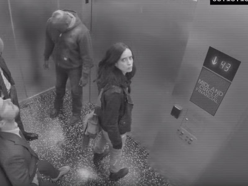 The teaser, which is shot from the perspective of an elevator security camera, shows all four heroes walk into an elevator that’s headed down to Midland Circle Financial — the site of the giant hole from Daredevil Season 2. Luke’s got his bullet-ridden hoodie on, and Matt is wearing a normal suit with a mask tied over his head. Presumably, since he’s the only one with a secret identity, he was caught a little off guard. None of them look especially happy to be there, and Jessica angrily destroys the surveillance camera, ending the teaser.