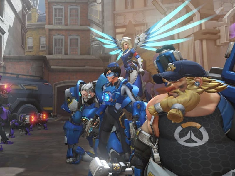 Torbjörn, Reinhardt, Tracer, and Mercy prepare to hold the line.