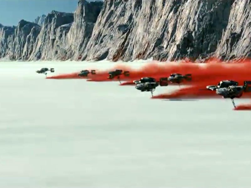 Crait’s exact place in the movie, like most of the plot, is still unknown at this point, but Johnson says “it ends up playing a key role in the movie.” The new skimmers, which he identifies as Resistance fighters, need to deal with “a very pressing and immediate” threat, which looks like it could be AT-ST Walkers off on the horizon, though they’re too small to tell for sure.