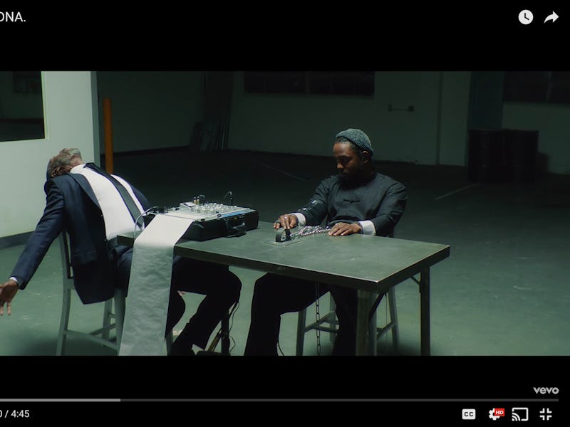 Cheadle, overwhelmed by the force of these lies, becomes possessed by the spirit of Lamar’s sincerity. He begins to rap the lyrics to “DNA.” and imitate his body movements. The two men take turns spitting out the words of “DNA.” at each other until finally, K. Dot wins; on the line “salute the truth,” the truth triumphs, and Cheadle releases Lamar. Kendrick leaves to finish the song in a new outro not found on the studio version of the track, and ScHoolboy Q punches the camera in a powerful closing shot.