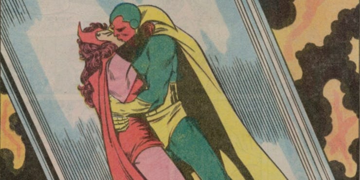 Scarlet Witch and Vision first met in The Avengers #75, and the pair soon became close. Their first kiss happened in issue #91 when they were losing a pretty bad fight to Ronan the Accuser, and they confessed their love for one another eight issues later.