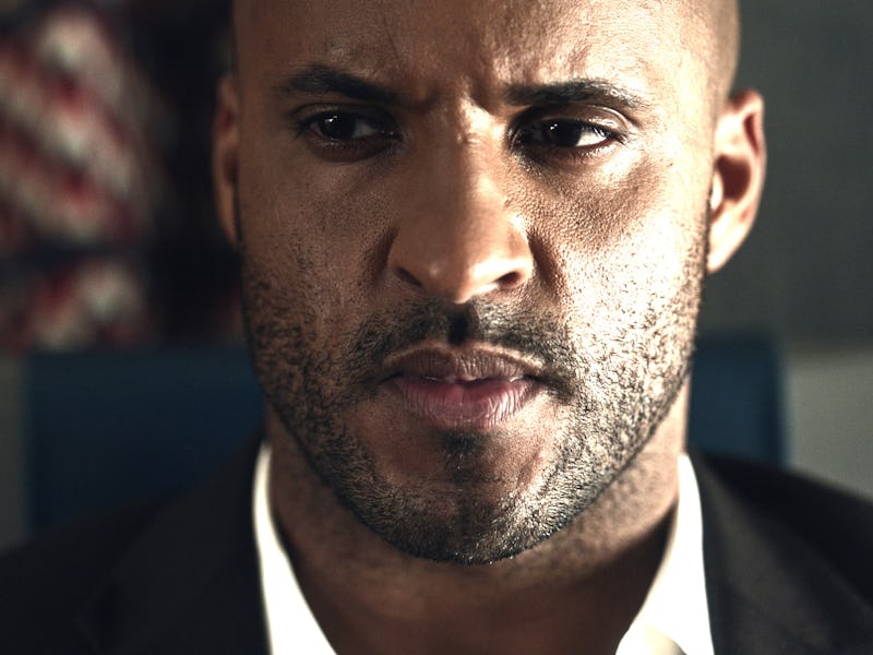 Prior to this scene, which is from the first episode, the audience meets Shadow (played by Ricky Whittle) while he’s in prison. He gets released early — but it’s hardly a celebratory event because he also finds out his wife is dead. Emotionally adrift and discombobulated from his time spent behind bars, he proceeds to the airport to fly home for her funeral.
