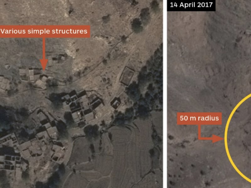 The first satellite images of the target, sourced from Airbus Defense and Space’s imaging services, appeared on Twitter on Thursday. The Mother of All Bombs, or MOAB, is the most powerful non-nuclear weapon in the U.S. military’s arsenal, and until last week had never been used in combat.