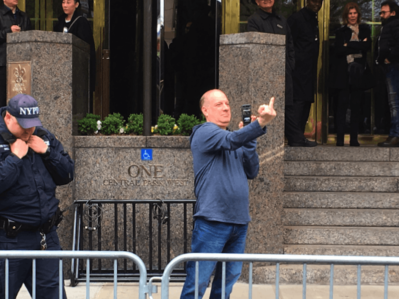 It’s unclear what the man’s objective was that morning, but he remained outside for over an hour, giving the thumbs up, joking around with guests exiting Trump Tower, and taking videos of himself flipping off the crowd. The crowds were as tireless as he was, marching on even as rain began to fall. All the while, neither side got the chance to converse.
