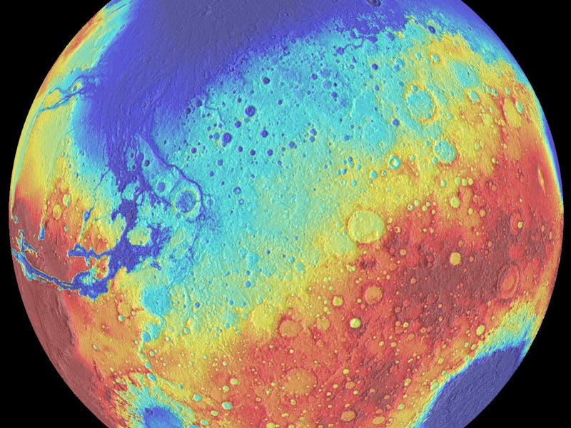A team from the Southwest Research Institute and the University of Arizona have mapped Mars’ impacts and found five major historical events, some of which show up in blue in the image below with the Borealis basin at the top, Hellas to the bottom right, and Argyre to the bottom left. Not shown are Utopia, which is now buried, and Isidis.