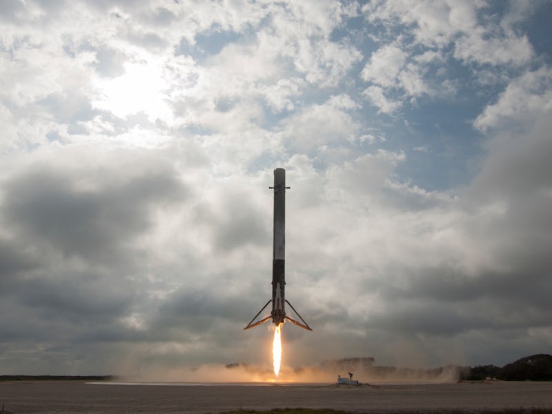 A Falcon 9 first-stage rocket booster back on Earth at the LZ-1 landing pad in February.