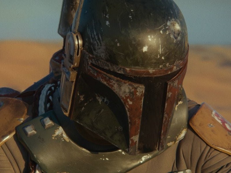 Hardcore Star Wars fans know that the Boba’s helmet isn’t exactly unique: people indigenous to the planet Mandalore all wear helmets of a similar style, including Boba’s “father,” Jango Fett. Meaning, this might not be Fett, but the helmet does have a very Mandalorian flavor.