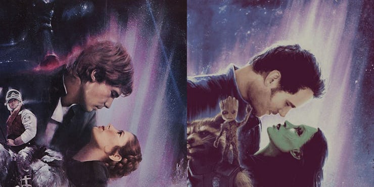 The original poster for the 1980 Star Wars sequel prominently featured Han Solo and Leia Organa’s impending romance. Han dipped Leia as they gazed into each other’s eyes, the style a direct reference to Clark Gable and Vivien Leigh on Gone with the Wind’s poster from 1939. Now, adding another layer of meaning is Ferguson’s poster, with Star-Lord and Gamora in the same romantic position.