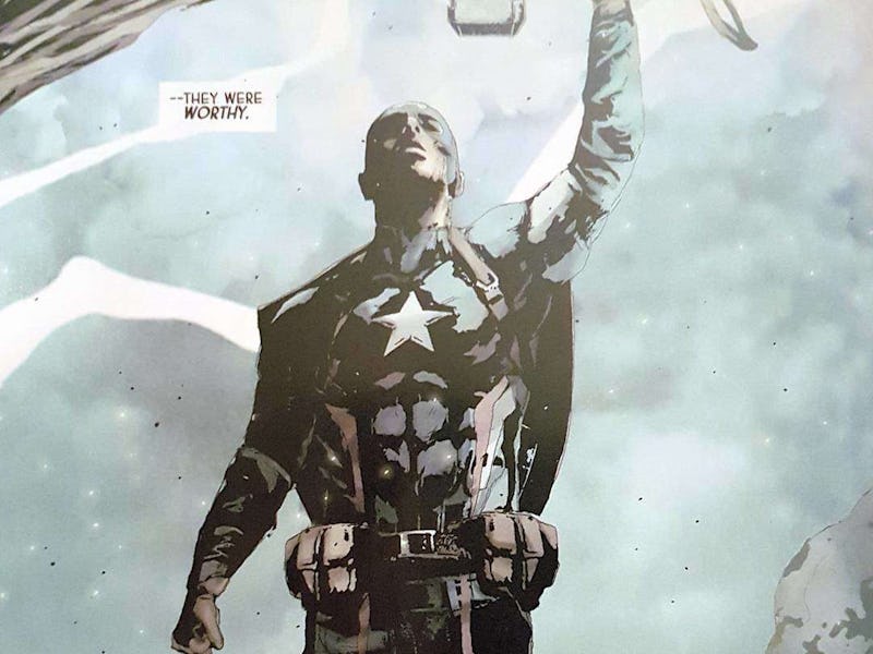 The Free Comic Book Day issue of Secret Empire ends with a truly shocking image: Captain America standing over the defeated Avengers and wielding Thor’s hammer, Mjölnir. This, of course, means that HydraCap is “worthy” of lifting the hammer. Considering the fact that the Nazi party tends to be comprised of huge Norse mythology fans, that’s a doubly-charged image.