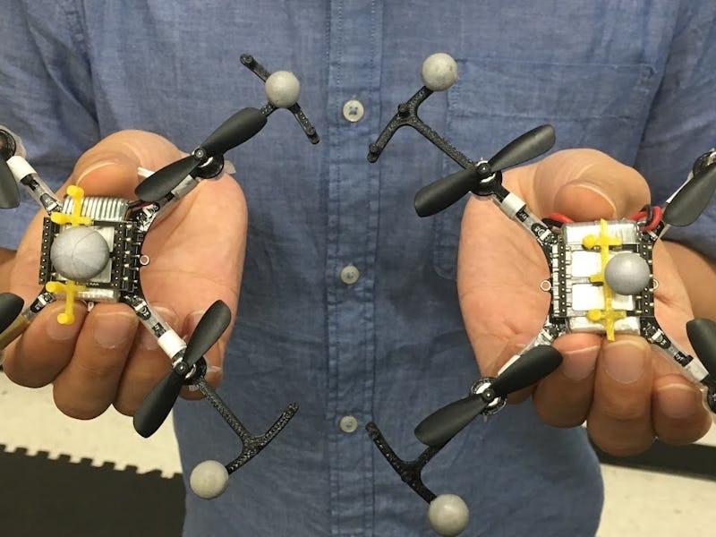 But researchers at Georgia Tech announced this week that they might have solved that problem by creating two new kinds of quadcopters that can swarm without crashing. The copters make use of what’s called a “barrier certificate” in order to define the space around themselves relative to the other drones. Dubbed more creatively a “Virtual Top Hat,” the barrier certificates ensure that the drones don’t collide with one another or fly too close together and disrupt the airflow of one of their companions. In a video released by researchers, the quadcopters can be seen flying in some pretty complex formations, all while zipping back and forth out of the way of the virtual top hats of the other drones.